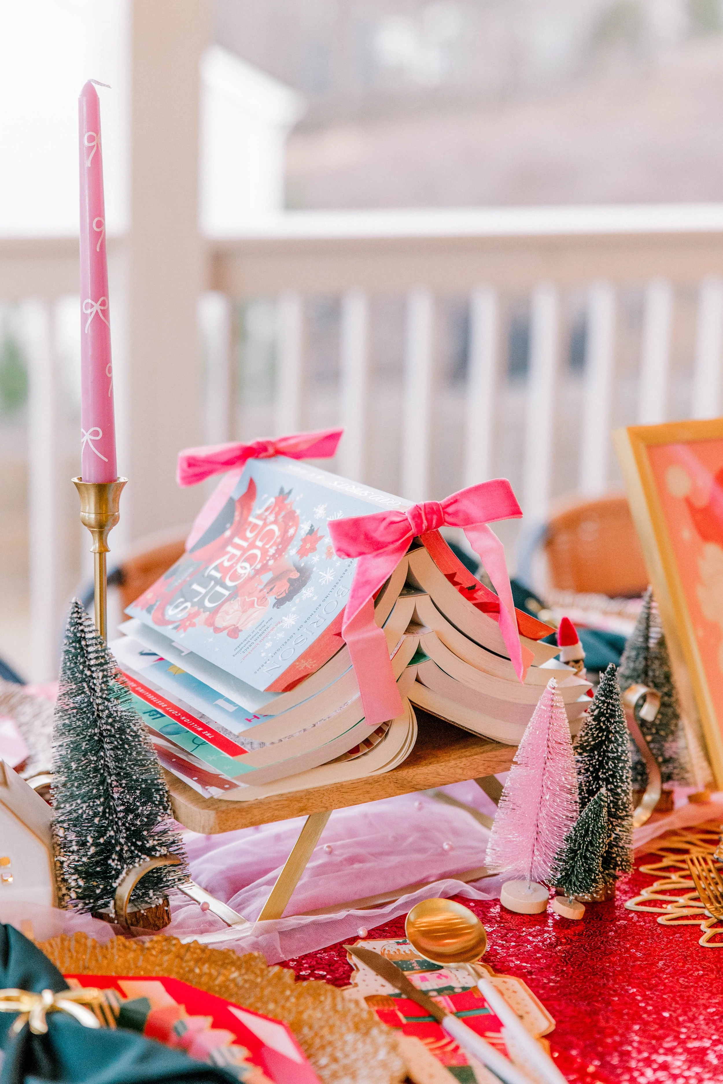 We leaned fully into a coquette Christmas theme, setting the scene with a red sequin tablecloth, soft pink bows, and whimsical bottle brush trees that brought a vintage-meets-feminine charm to the night. Paired with twinkling lights and the glow of good conversation, the space felt warm, celebratory, and perfectly us. As a centerpiece, we used a book tree with our favorite holiday rom-coms of the season. Everyone arrived dressed in their Christmas best, adding sparkle, velvet, and bows to an already magical evening.